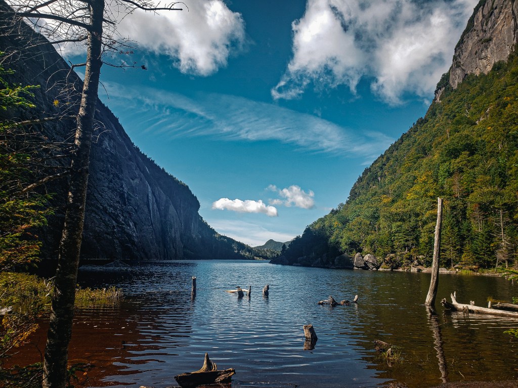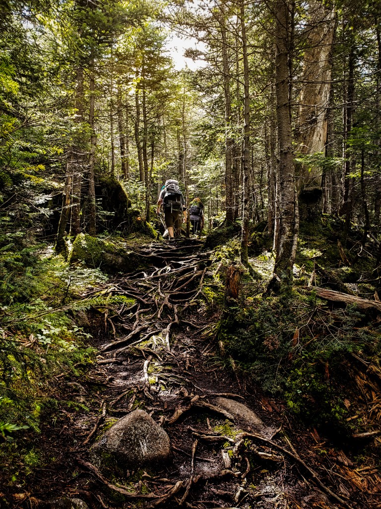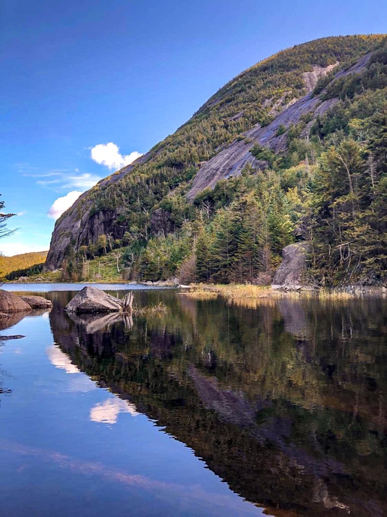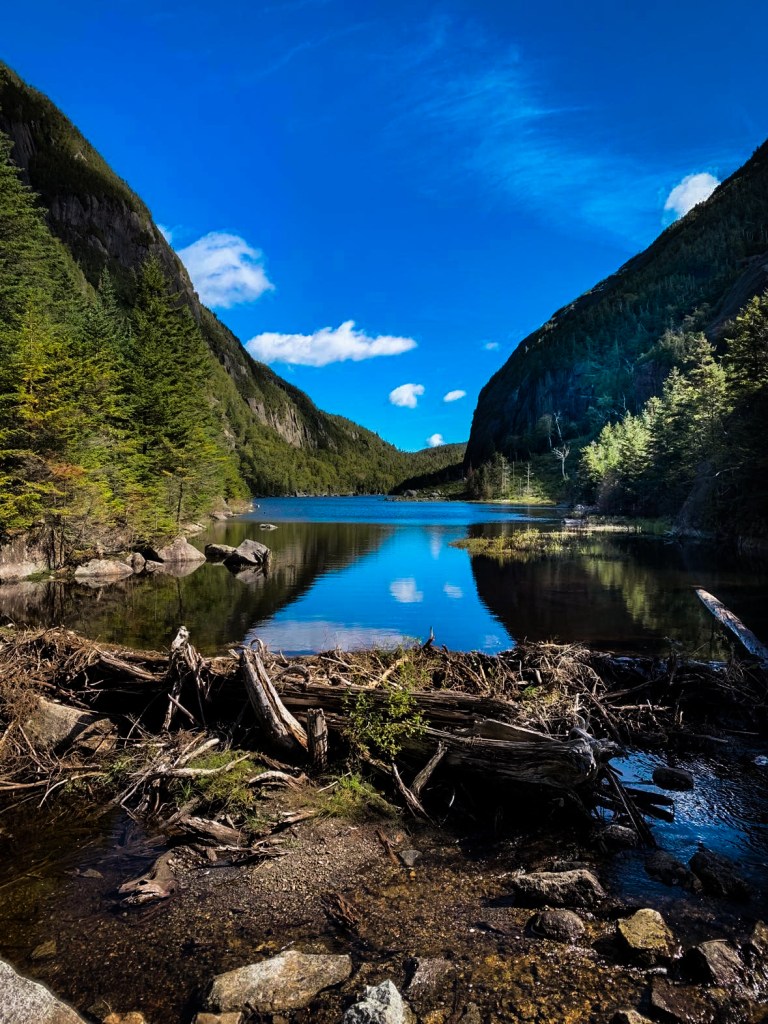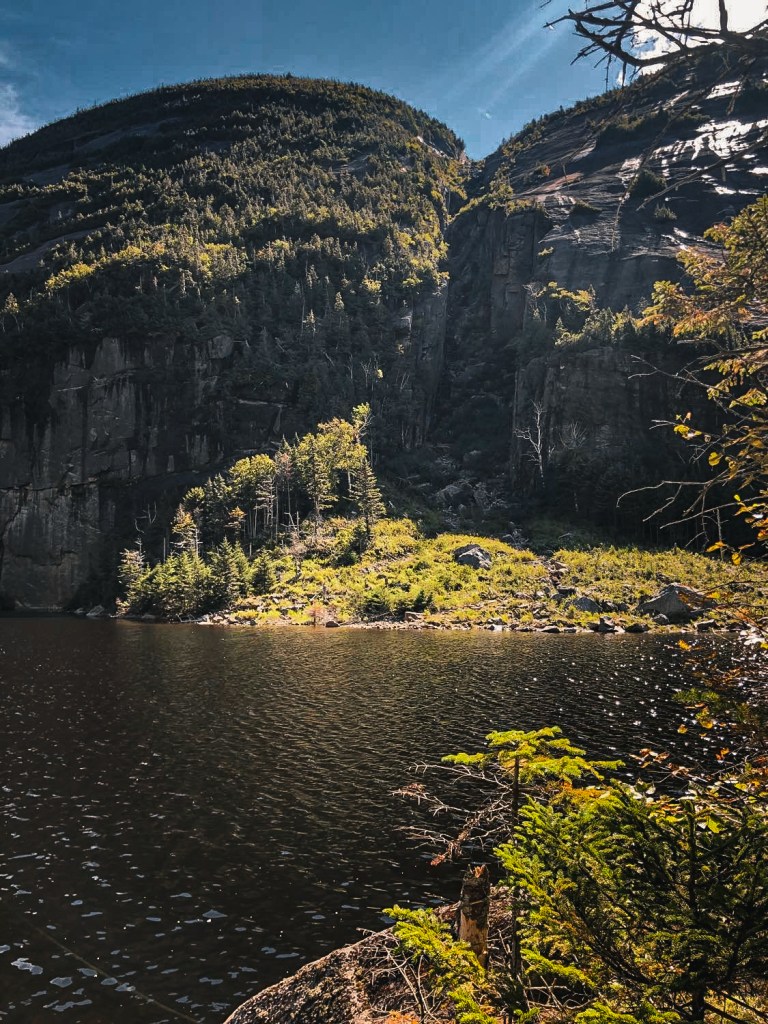 The forest parted at last, and sunlight streamed onto the banks of Avalanche Lake. They were littered with driftwood and mountain trash, but we weren’t looking at the ground anymore. Water flowed in a rippled line between the twin towers of Avalanche Mountain to the west and Mount Colden to the east. Trees upon trees dug their roots into the banks, clung to stone walls, and sat atop ledges. They had descriptive names like Mountain Ash, Sugar Maple, Quaking Aspen, Yellow Birch, and Pitch Pine. These names seemed to convey a personality, and it was easy to imagine them coming to life and wandering up the peaks for secret meetings in the night. They would, I think, speak a language of movement and odd music, their creaks, groans, whispers and rasps echoing over the water and stirring up tales of the bogeyman.