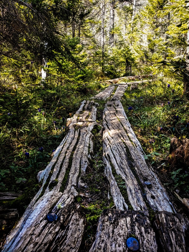 After sharing a few snacks, we crossed a small bridge that had been placed downstream in a less flood-prone area and stepped onto Avalanche Pass. The trail sloped upward along an old creek bed. Megalithic stones and cliff sides created intermittent hallways and obstacles. Rag, Map, and Ribbon Lichen festooned their surfaces in chaotic patterns of seafoam, chartreuse, and sage green.