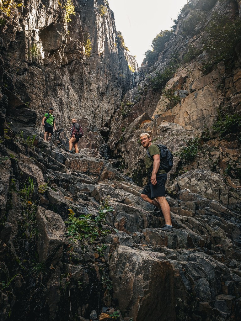 We began our ignorant ascent, bounding up and over rocks and boulders. Hairy moss and dry grasses grew in patches of loose dirt and gravel. Water wept downhill to our left, and we avoided slippery splash zones, weaving from shade to rare patches of sunlight that warmed my skin. I was glad I’d worn shorts, leaving my legs free to bunch and stretch as needed. Handholds were plentiful, and after what felt like the first real bit of climbing, I allowed myself to wallow in a sense of accomplishment. Maybe I wouldn’t be exactly comfortable at this height, but I didn’t feel phobic.