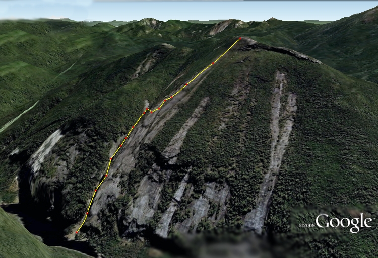 Irene’s final assault was hurled when the climb was nearly over. I was forced once again out of my chosen hell and back onto the slide where it had not only become steeper, but slick from the water that seeped out of Colden’s crown. I thought about how this would be the worst place of all to go down, and allowed myself a moment of panic before moving on. It was only about ten feet up and another seven across to the goat path that led to the Mount Colden Trail.