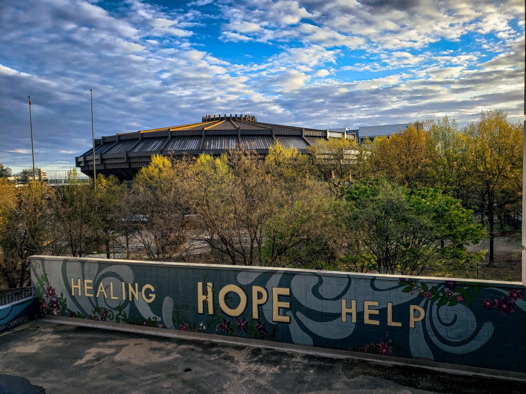 Initially, VCU provided my mother with a small but serviceable hotel room down the street from the hospital. A few days a week, students from their campus made dinner, and from her door you could see a mural with the words, ‘Healing, Hope, Help’ writ large. My mother joked that the people in neighboring rooms might think her a madwoman, because she had screamed, cried harder than she had ever cried in her life, flung herself about in a rage, and laughed uproariously all in a ten-hour span. I thought each of these rooms had likely seen similar fits. They were capsules of grief.
